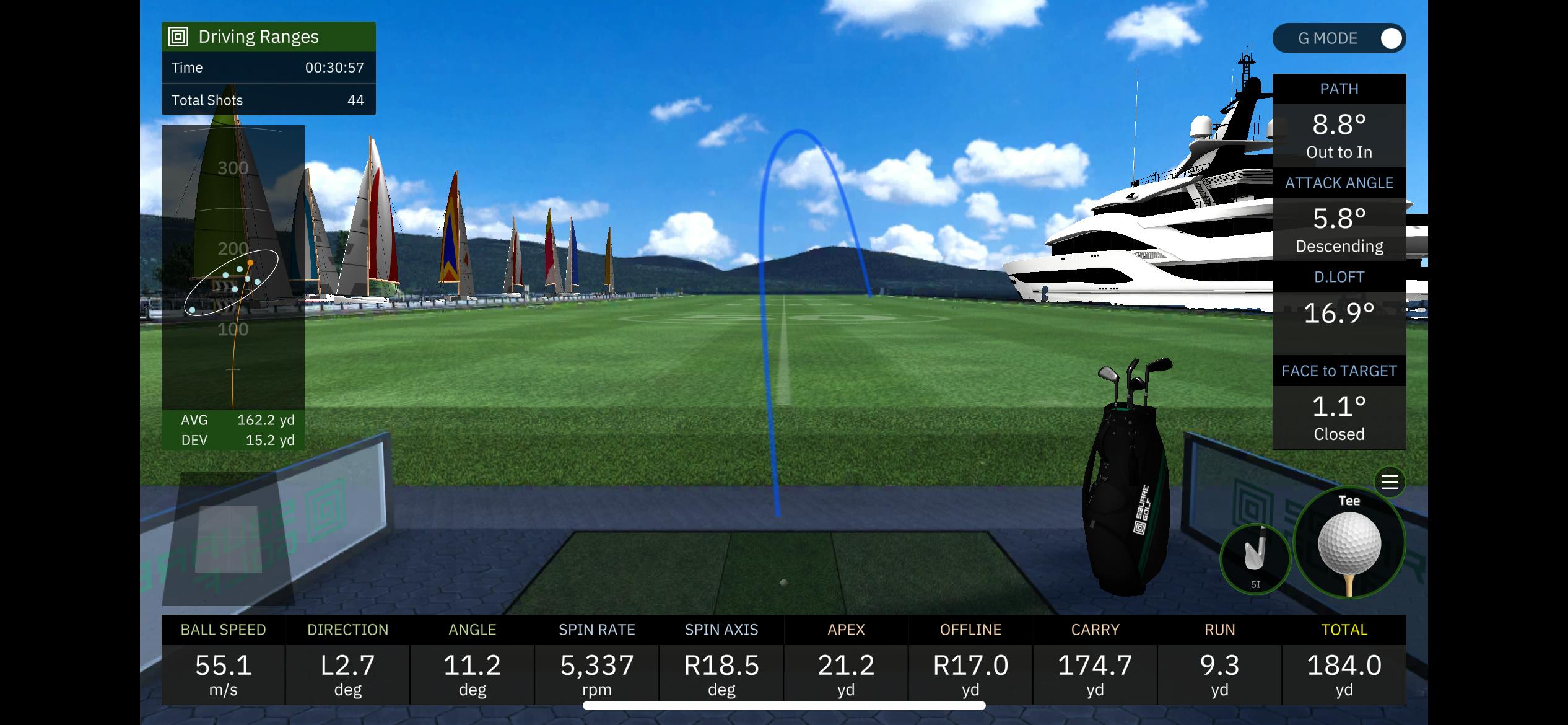 - Ball data: Speed, Direction, Launch Angle, Spin Rate, Apex, Carry, Run, Total
